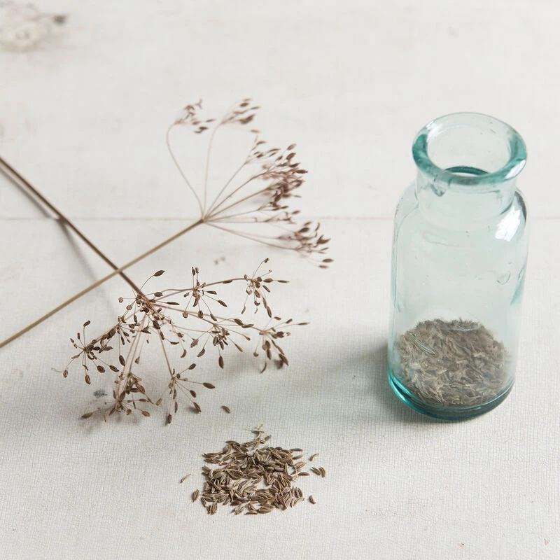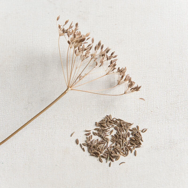 Easy to grow once established. White umbel flowers form in spring of second year, attracting beneficial insects, such as hover flies. Harvest seed heads when plump and light brown, hang to dry. Thresh to remove seeds. One plant produces approx. 5 Tbs. of seed. Used in breads and savory dishes to lend an earthy, mild anise flavor.