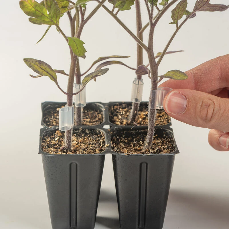 Preferred by the Johnny’s research team. Flexible, food-grade silicone provides even pressure. Tube-shaped channel for use with support stakes (sold separately). 1.5 mm opening. Choose from three sizes for different stem widths. Pack of 200. Call for bulk sizes.